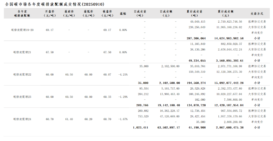 2025年1月1日至9月10日,全国碳市场碳排放配额成交量76,909,357吨,成交额5,533,018,144.18元。
