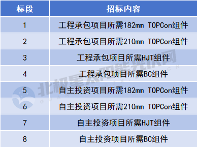 招标公告显示,此次招标总规模预估为17GW,共划分为8个标包,涵盖182mm TOPCon组件、210mm TOPCon组件、HJT组件、BC组件。