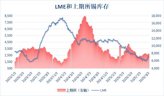 以下为2025年8月以来LME和上期所锡库存数据:(单位:吨)