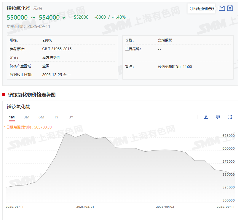 9月11日,稀土市场价格整体继续走弱。其中,氧化镨钕价格下调至55-55.4万元/吨,其均价为55.2万元/吨,较前一交易日下调8000元/吨,跌幅为1.43%。而55.2万元/吨这一均价与8月19日的高点63.35万元/吨相比,不到一个月的时间里下跌了8.15万元/吨,跌幅为12.87%。