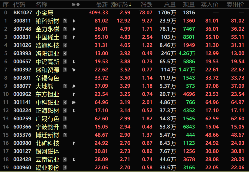 9月11日,小金属板块表现活跃,这一态势的形成与钨、稀土等细分领域的市场动态及多重驱动因素密切相关。具体来看,受部分持货商出货需求增加的影响,钨价在创下历史新高后处于“暂稳”状态。而稀土市场则呈现出价格与股价的分化:因前期涨幅过快,市场观望情绪升温,叠加贸易商低价出货动作增多,稀土现货价格近来出现回调;不过,资本市场依然青睐稀土股,使得9月11日稀土市场展现出了现货价格下跌而多只稀土永磁股强势上涨的景象。此外,今年1至8月,我国汽车产销量首次双超2000万辆,新能源与科技产业的爆发式增长带来了市场对小金属终端需求增加的预期。同时,上半年多只小金属股净利润大增,行业整体盈利能力提升,吸引了部分市场资金的关注。在这些因素的共同带动下,小金属板块在9月11日出现明显上涨,截至当日收盘,板块涨2.59%;个股方面,铂科新材涨近13%,中国稀土、金力永磁、中钨高新、宜安科技、盛和资源以及北方稀土等涨幅居前。