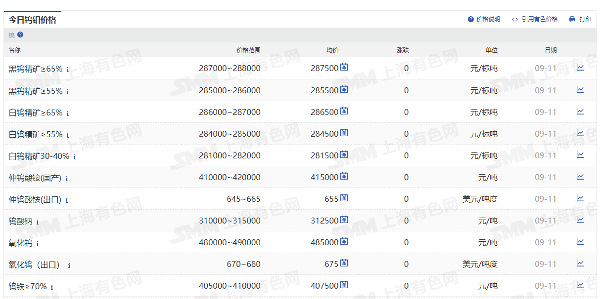 9月11日,黑钨精矿(≥65%)价格为287000~288000元/标吨,均价报287500元/标吨,与前一交易持平,而黑钨精矿的均价自9月8日升至287500元/标这一历史新高之后,部分持货商出货需求的增加带来供应有所上升,钨价便“暂稳”于此!值得一提的是,287500元/标吨这一均价新高与2024年12月31日的均价142750元/标吨相比,其均价今年以来上涨了144750元/标吨,今年以来的涨幅为101.4%。