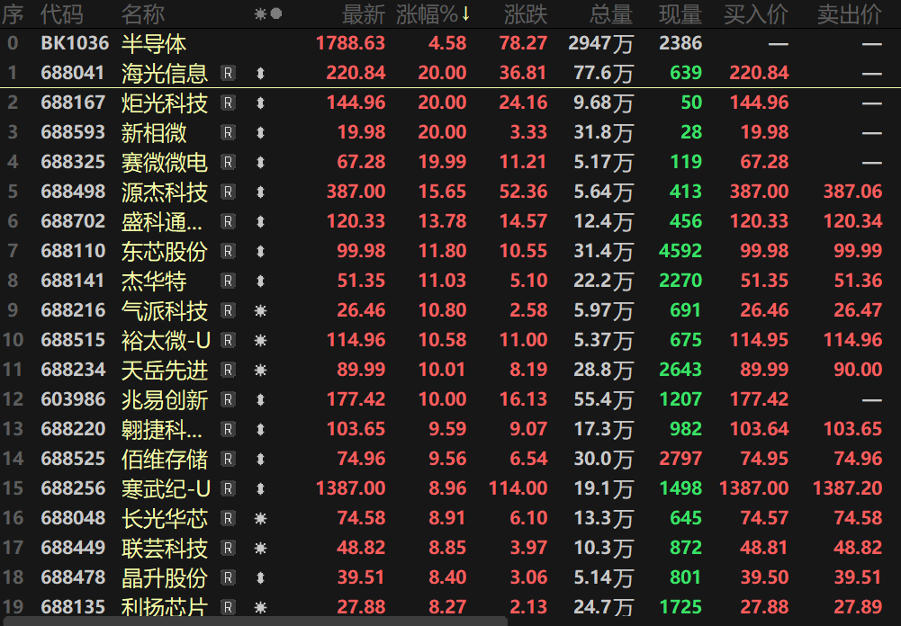 SMM 9月11日讯:9月11日上午,半导体板块在临近午间突然发力,板块指数一度涨逾4%,在一众行业板块中排名前列。个股方面的表现也十分惹眼,海光信息、炬光科技、新相微,赛微微电等多股盘中20CM涨停,源杰科技、杰华特、利扬芯片等多股纷纷跟涨。