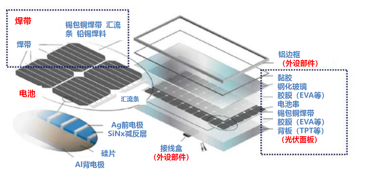 八大主材包含:电池片、焊带、玻璃、EVA、背板、边框、硅胶、接线盒。