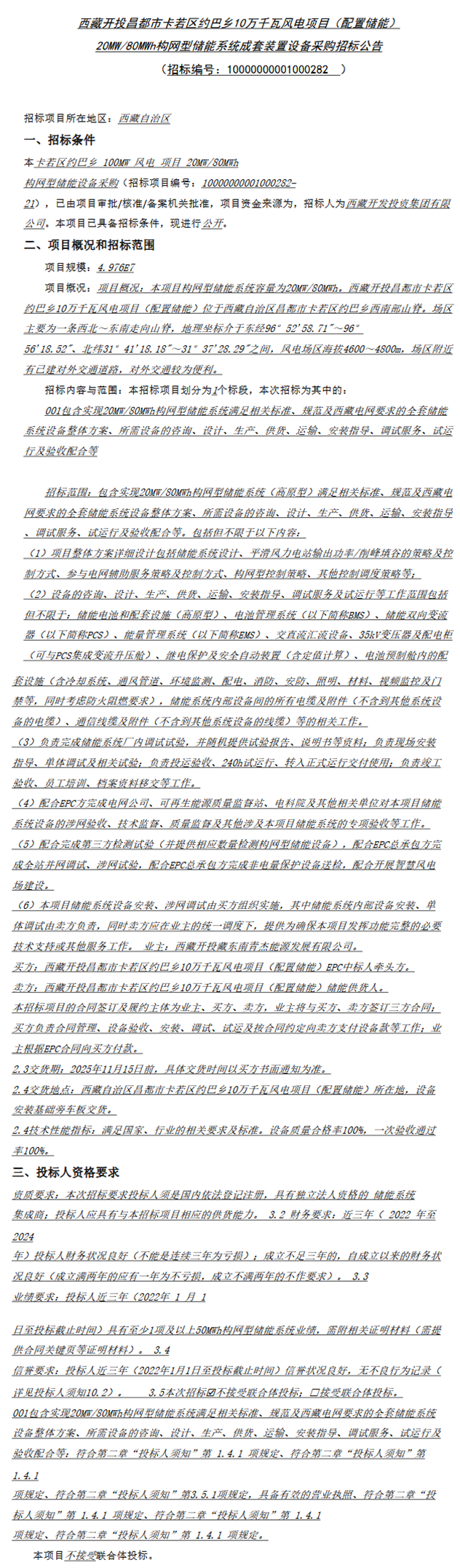 9月11日,西藏开发投资集团有限公司发布西藏开投昌都市卡若区约巴乡10万千瓦风电项目(配置储能) 20MW/80MWh构网型储能系统成套装置设备采购招标公告。项目位于本项目位于西藏自治区昌都市卡若区约巴乡西南部山脊,采购20MW/80MWh的构网型储能系统。