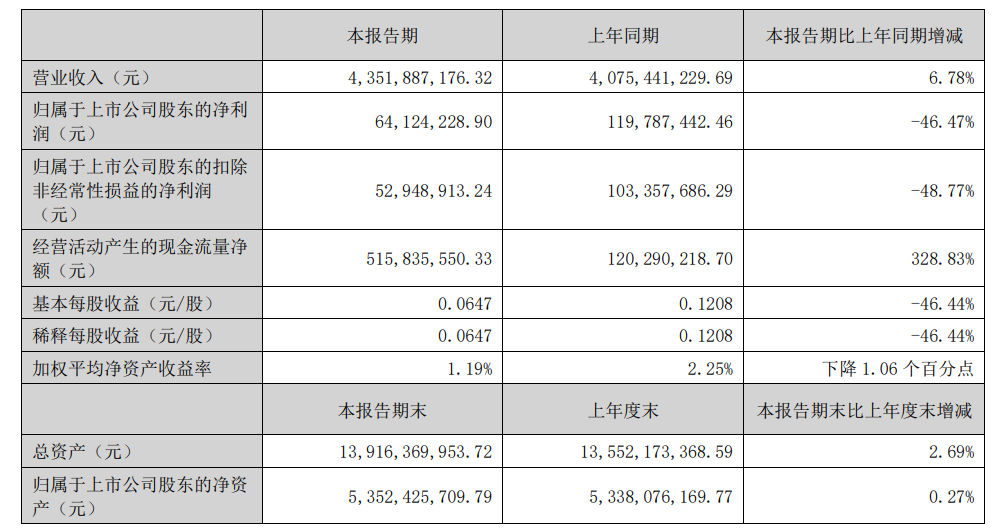 宝武镁业8月28日发布的2025半年度报告显示,上半年,公司实现营业收入43.52亿元,同比增长6.78%,主要是铝合金挤压产品、中间合金销量同比增加;归母净利润6412.42万元,同比下滑46.47%;扣非归母净利润5294.89万元,同比下滑48.77%。归属于上市公司股东的扣除非经常性损益的净利润为5,294.89万元,与去年同期相比下降48.77%。主要受镁价下行影响,镁合金毛利率下降,公司业绩同比下降。