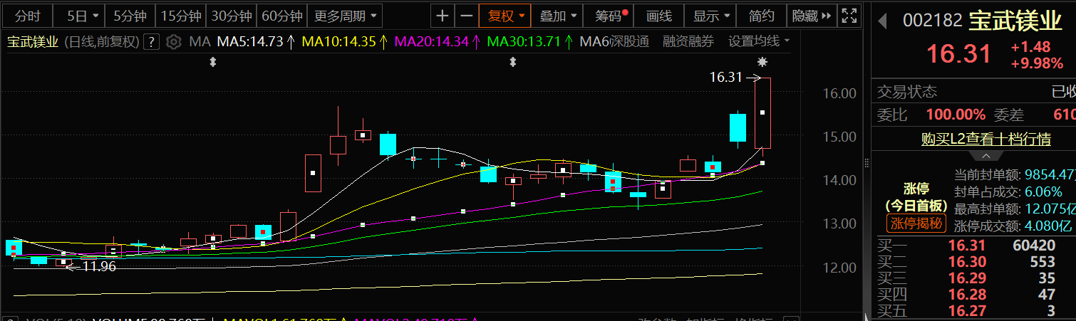 9月11日,宝武镁业股价11日午后出现涨停,并封住16.31元/股的涨停价直至收盘。