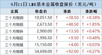 伦敦时间9月11日17:00(北京时间9月12日00:00),LME三个月期铜上涨38.5美元,或0.38%,收报每吨10,051.5美元。盘中一度高见10,062美元,为3月26日以来高位,连续第二个交易日突破10,000美元关口。