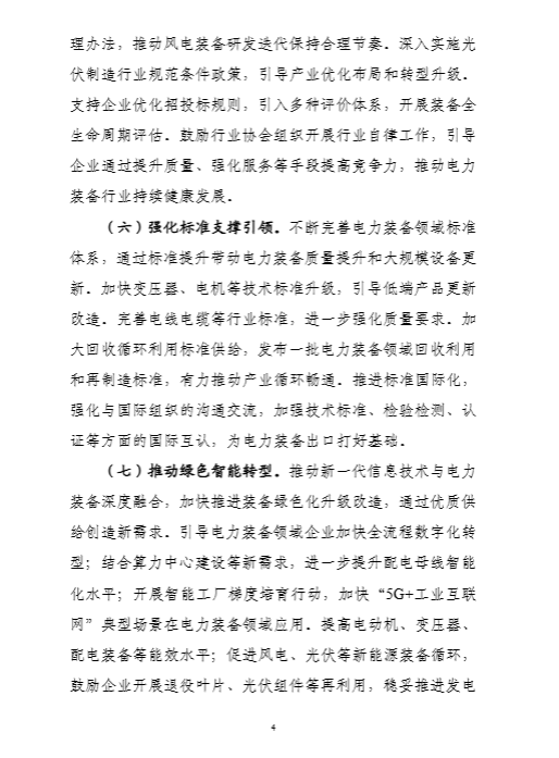 其中提到,推动绿色智能转型。推动新一代信息技术与电力装备深度融合,加快推进装备绿色化升级改造,通过优质供给创造新需求。引导电力装备领域企业加快全流程数字化转型;结合算力中心建设等新需求,进一步提升配电母线智能化水平;开展智能工厂梯度培育行动,加快“5G+工业互联网”典型场景在电力装备领域应用。提高电动机、变压器、配电装备等能效水平;促进风电、光伏等新能源装备循环,鼓励企业开展退役叶片、光伏组件等再利用,稳妥推进发电机、齿轮箱等高附加值产品再制造。
