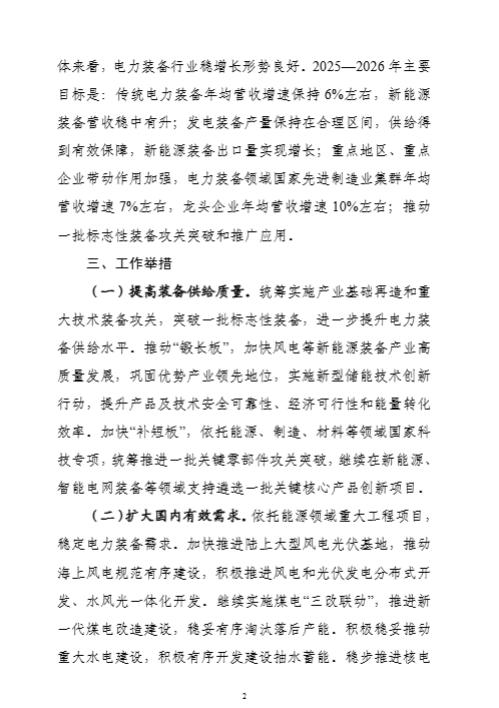 工业和信息化部、市场监管总局、国家能源局印发《电力装备行业稳增长工作方案(2025-2026年)》。其中提到,近年来,全球能源结构绿色低碳转型加速推进,我国正加快构建新型电力系统,为电力装备行业带来旺盛需求,整体来看,电力装备行业稳增长形势良好。2025—2026年主要目标是:传统电力装备年均营收增速保持6%左右,新能源装备营收稳中有升;发电装备产量保持在合理区间,供给得到有效保障,新能源装备出口量实现增长;重点地区、重点企业带动作用加强,电力装备领域国家先进制造业集群年均营收增速7%左右,龙头企业年均营收增速10%左右;推动一批标志性装备攻关突破和推广应用。