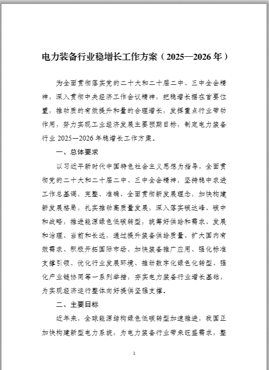 现将《电力装备行业稳增长工作方案(2025-2026年)》印发给你们,请结合实际抓好落实。