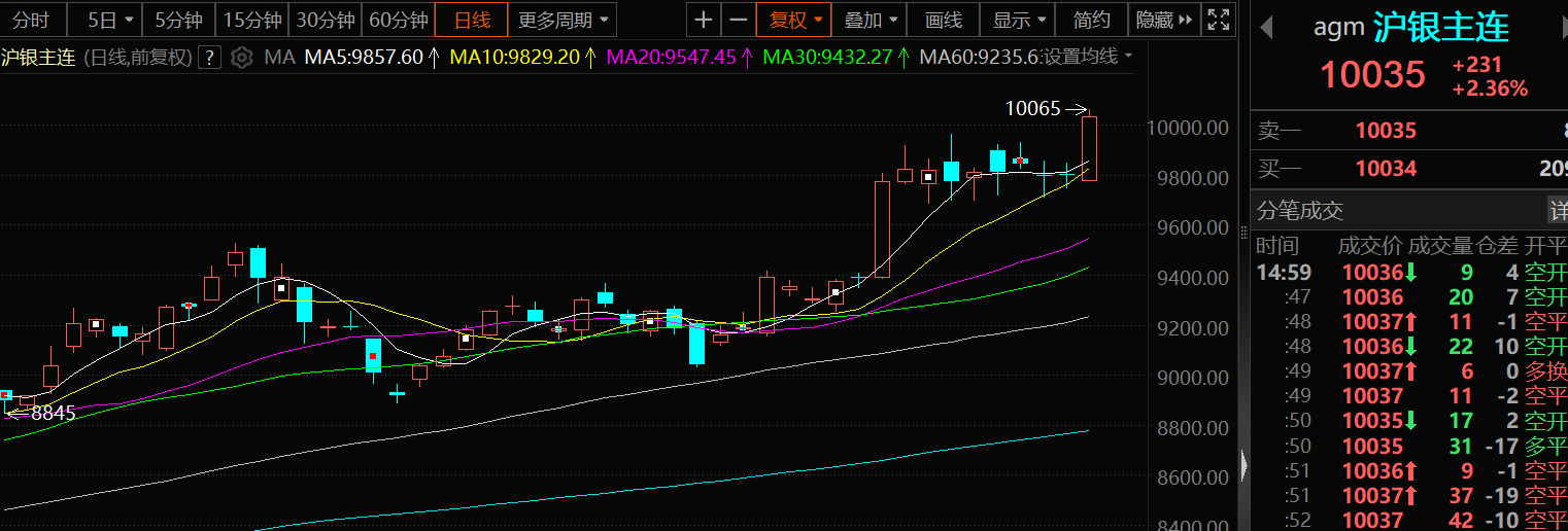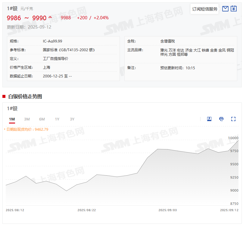 在沪银期货和白银T+D均升破万元大关,并刷新了上市以来的新高之后,白银现货价格也随之走高,9月12日,SMM1#白银上午出厂参考均价为9988元/千克,均价较前一交易日上涨200元/千克,涨幅为2.04%。据SMM了解,银价突破历史新高后,现货市场多观望,询盘较少。