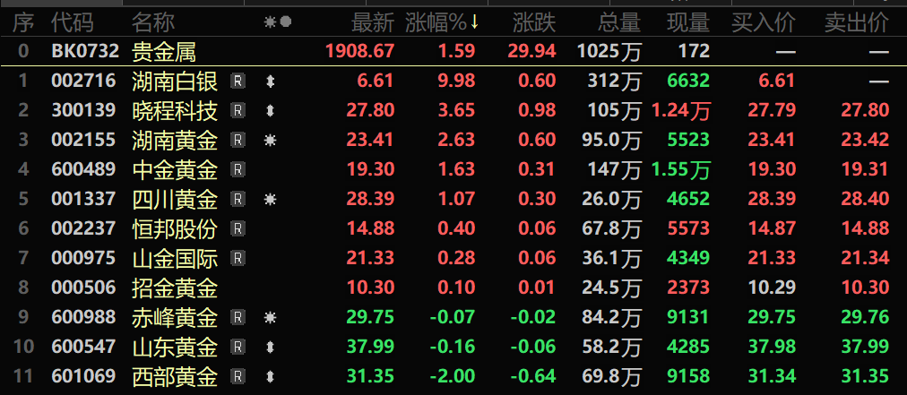 股市方面:贵金属板块9月12日出现上涨,截至9月12日收盘,贵金属板块涨1.59%,个股方面:湖南白银涨停,晓程科技、中金黄金、湖南黄金及四川黄金等涨幅居前。