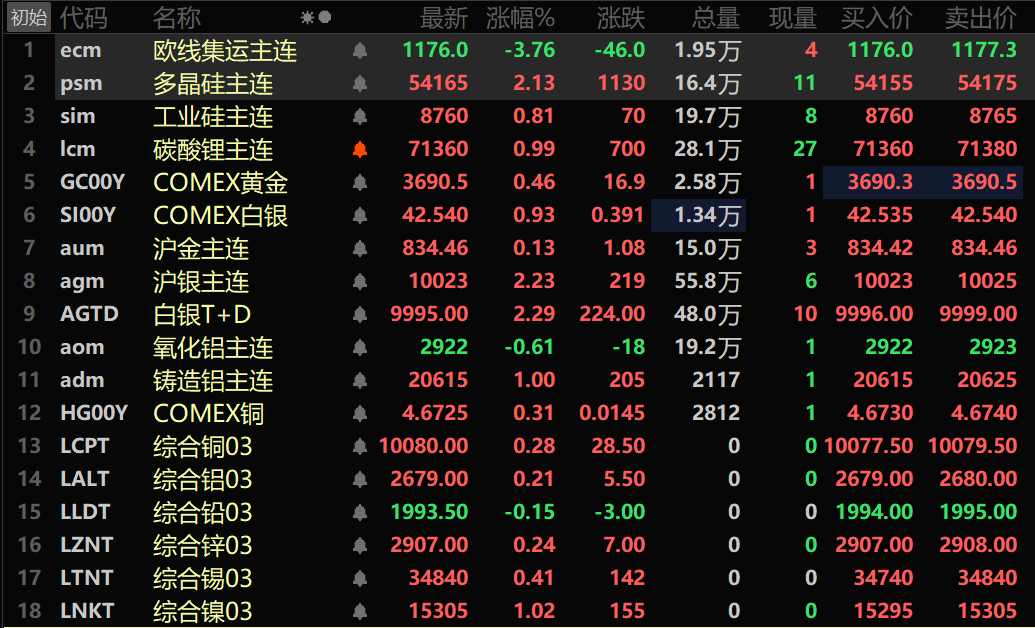 此外,铸造铝主连期货涨1%,氧化铝主连涨0.61%。碳酸锂主连涨0.99%,工业硅主连涨0.81%。多晶硅主连涨2.13%。