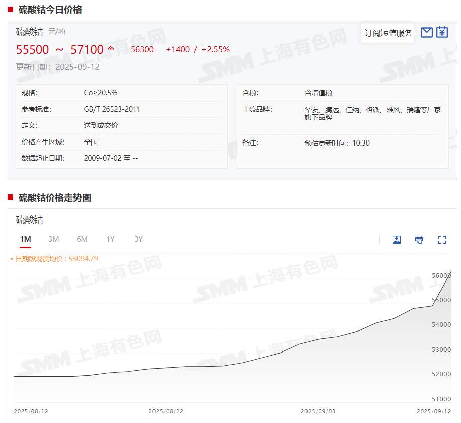 据SMM现货报价显示,本周硫酸钴现货报价同样呈现震荡上行的态势,截至9月12日,硫酸钴现货报价涨至5.55~5.71万元/吨,均价报5.63万元/吨,较9月5日上涨2450元/吨,涨幅达4.55%。