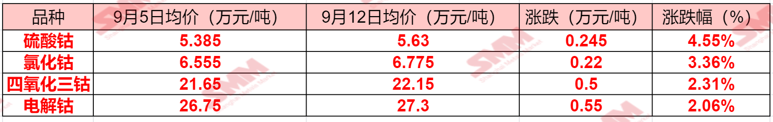 SMM 9月12日讯:本周钴系产品现货报价整体呈现上涨态势,钴中间品价格的上涨对钴盐及电解钴价格的涨势均带动明显,不过电解钴方面高库存的情况对钴价上涨仍有制约。硫酸钴方面,下游旺季叠加成本提升,带动其短期价格或呈现偏强运行的态势,如此情况能否持续?……SMM整理了本周钴系产品的价格变动情况,具体如下: