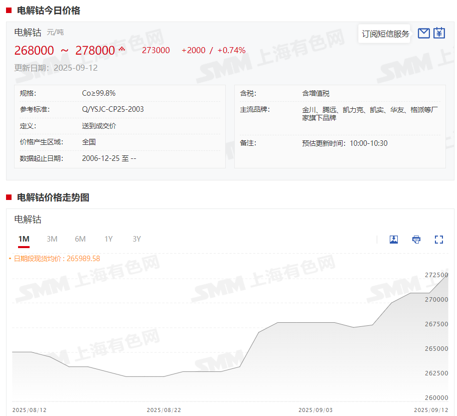 据SMM现货报价显示,本周电解钴现货报价一改9月5日的跌势,其现货报价震荡上行,截至9月12日,电解钴现货报价涨至26.8~27.8万元/吨,均价报27.3万元/吨,较9月5日上涨5500元/吨,涨幅达2.06%。