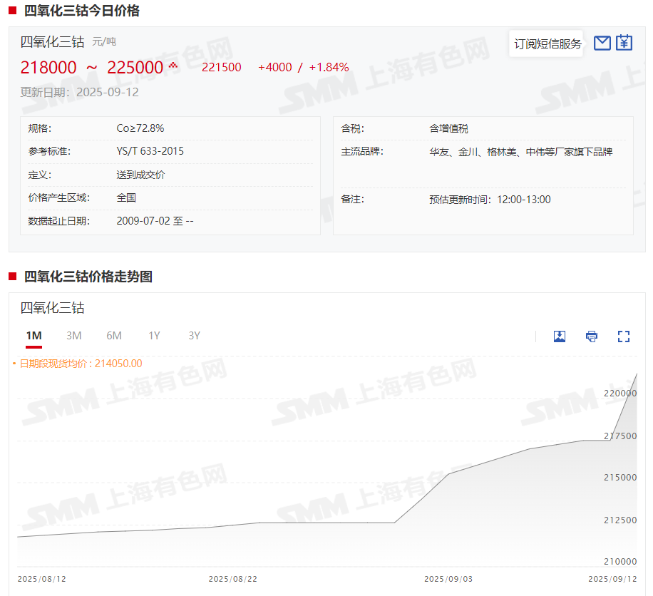 据SMM现货报价显示,本周四氧化三钴现货报价同样继续上涨,截至9月12日,氯化钴现货报价涨至21.8~22.5万元/吨,均价报22.15万元/吨,较9月5日上涨5000元/吨,涨幅达2.31%。