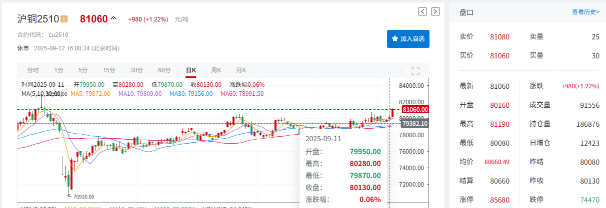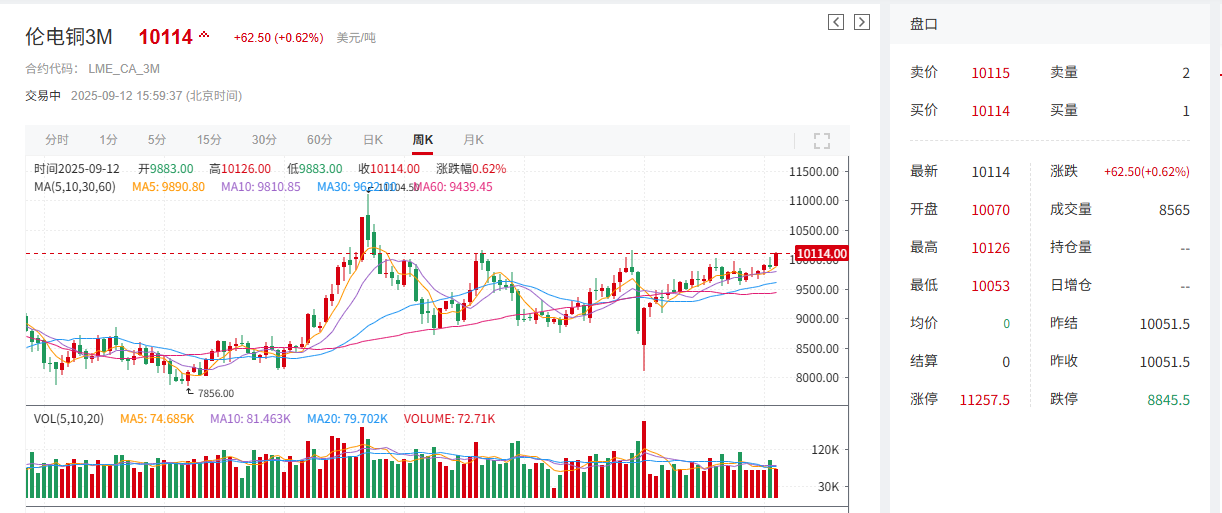 在上述因素的共同作用下,铜价呈现显著上涨态势:截至9月12日15:59,伦铜上涨0.62%,报10114美元/吨,当周周线暂涨2.19%;沪铜上涨1.22%,报81060元/吨,周线实现三连涨,本周涨幅达1.4%。
