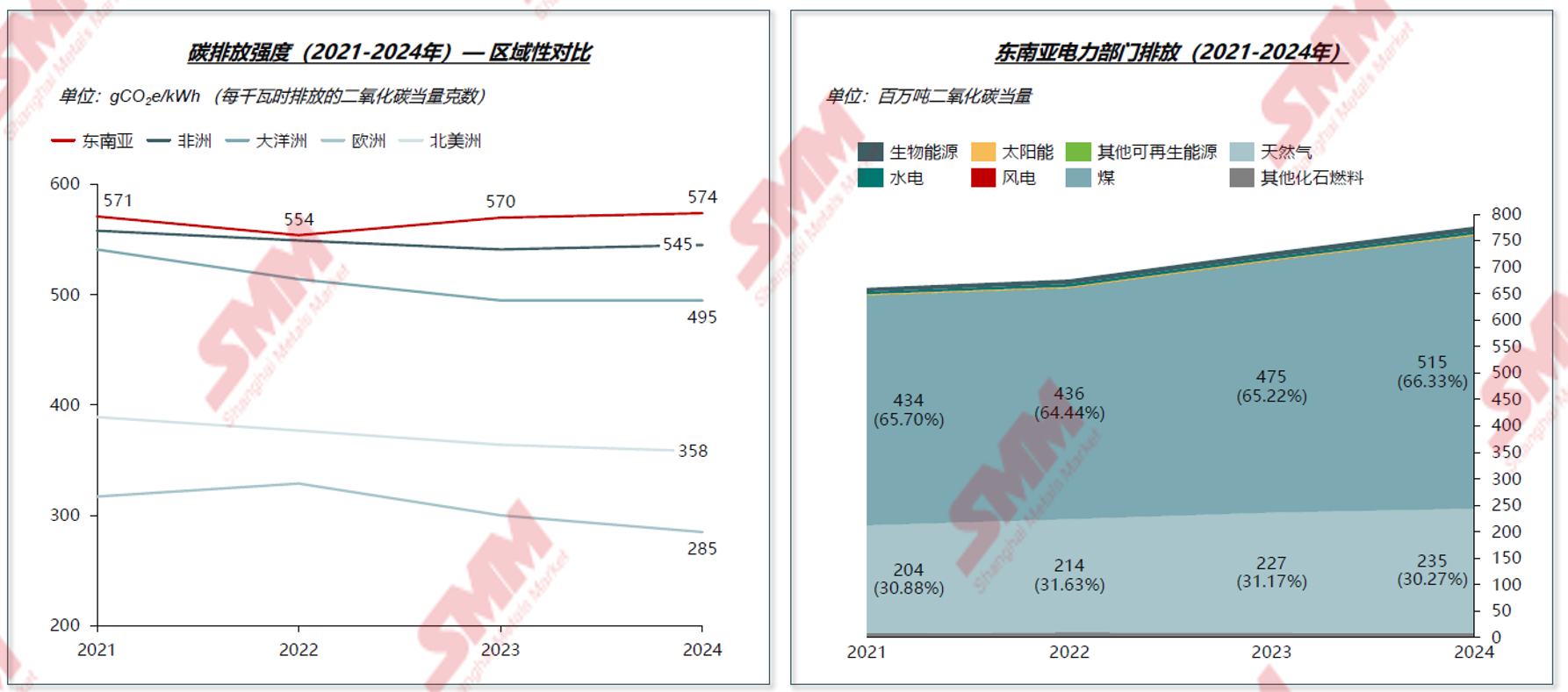 根据不同地区碳排放强度在2021年到2024年的对比情况,东南亚地区在2022年到2024年因高碳能源大规模使用加剧环境压力,碳排放强度逐年攀升。电力部门的排放能源分类中,煤的二氧化碳排放量最高,能源转型迫在眉睫。