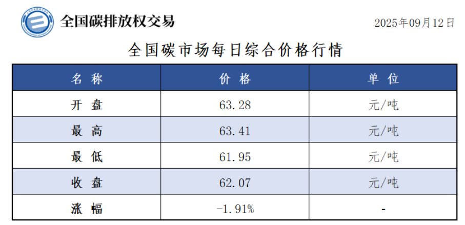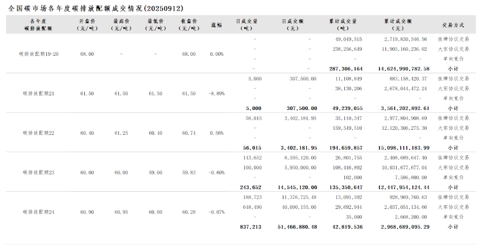 2025年1月1日至9月12日,全国碳市场碳排放配额成交量79,106,595吨,成交额5,668,220,975.40元。