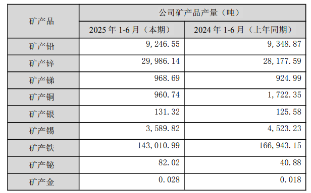 矿产品产量:2025 年 1-6 月,公司生产矿产锡 3,589.82 吨,较上年同比减少 20.64%;矿产银 131.32 吨,较上年同比增长 4.57%;矿产锌29,986.14 吨,较上年同比增长 6.42%;矿产铅 9,246.55 吨,较上年同比减少1.09%;矿产铜960.74 吨,较上年同比减少 44.22%;矿产锑 968.69 吨,较上年同比增长4.72%;矿产铁 14.30 万吨,较上年同比减少 14.34%。矿产铋 82.02 吨,较上年同比增长100.64%,矿产金 0.028 吨,较上年同比增长 55.56%。