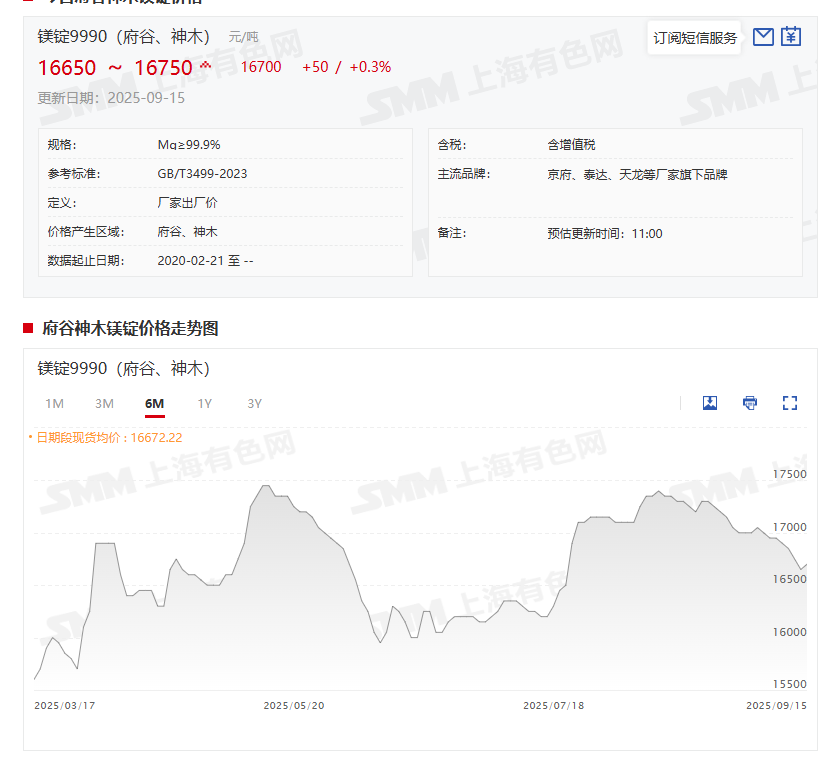 据SMM报价显示:9月15日,SMM镁锭9990(府谷、神木)主流报价为16650-16750元/吨,较前一交易日上涨50元/吨。镁价15日坚挺运行,主要是因为镁价在周末受到外贸客户入场采购而触底反弹,但需求方在外贸需求交单后呈现后继无力的态势,受此影响,15日,市场成交较为冷清,部分镁厂在15日下午开始低价出货刺激镁锭成交,镁市呈现弱势运行态势。后市仍需关注需求端口的变化。