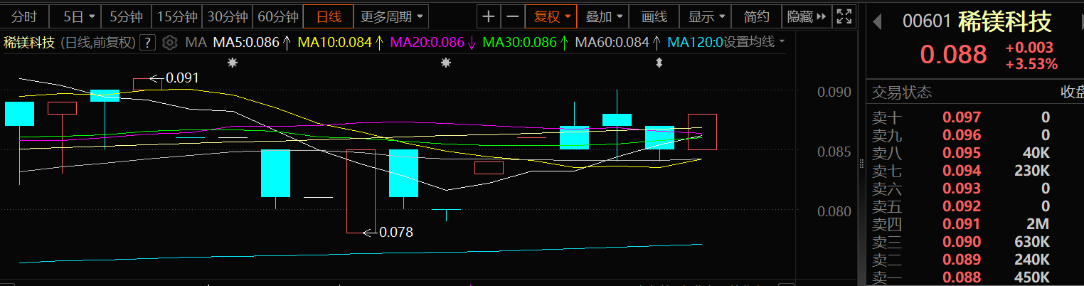9月15日,稀镁科技股价出现上涨,截至15日收盘,稀镁科技涨3.53%,报0.088港元/股。