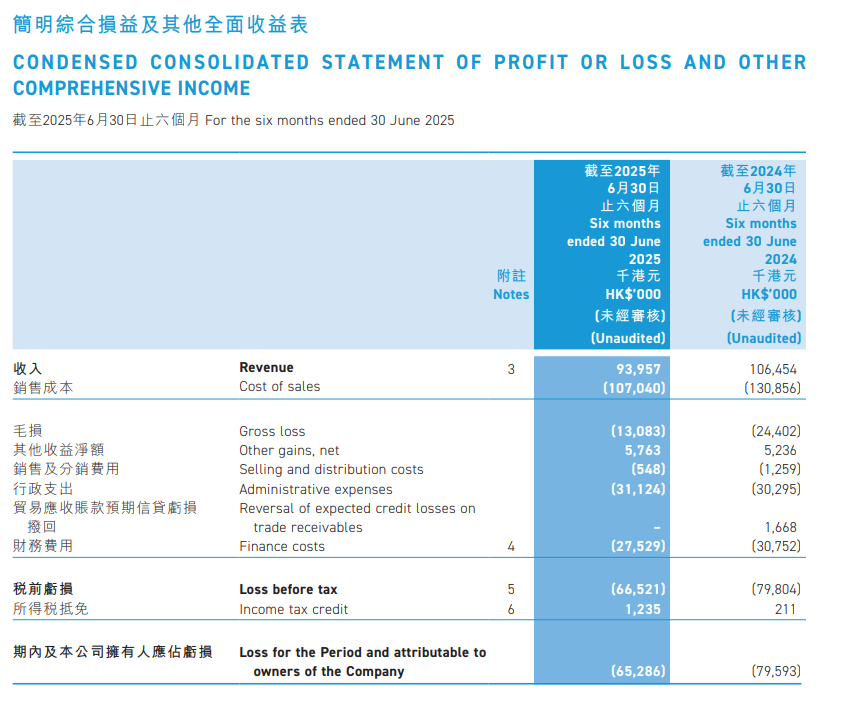 稀镁科技9月12日披露2025年中期报告显示:截至2025年6月30日止六个月,集团整体收入为93,957,000港元,较去年同期的106,454,000港元减少约11.9%。镁产品业务之整体毛损率为13.9%,较去年同期的毛损率22.9%改善约9个百分点。期内税后亏损减少至65,286,000港元(2024年同期:79,593,000港元)。总销量由2024年同期的6,236吨轻微下降至期内的6,155吨,同比下降约1.3%。