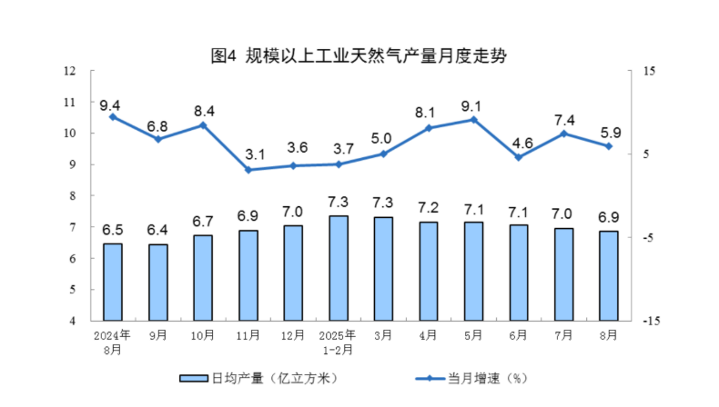 天然气生产稳定增长。8月份,规上工业天然气产量212亿立方米,同比增长5.9%;日均产量6.9亿立方米。