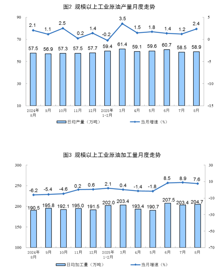原油生产增速加快。8月份,规上工业原油产量1826万吨,同比增长2.4%,增速比7月份加快1.2个百分点;日均产量58.9万吨。