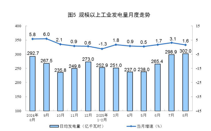 规上工业电力生产平稳增长。8月份,规上工业发电量9363亿千瓦时,同比增长1.6%;日均发电首次突破300亿千瓦时,达302.0亿千瓦时。1—8月份,规上工业发电量64193亿千瓦时,同比增长1.5%,扣除天数原因,日均发电量同比增长1.9%。