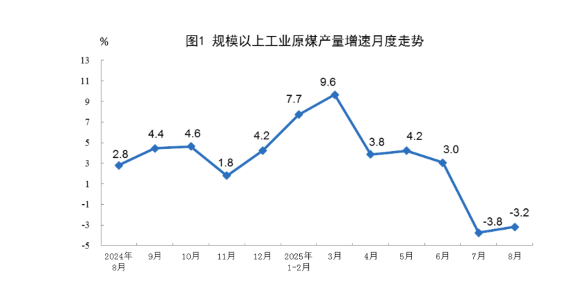 原煤生产降幅收窄。8月份,规上工业原煤产量3.9亿吨,同比下降3.2%,降幅比7月份收窄0.6个百分点;日均产量1260万吨。