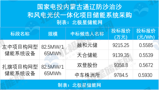 北极星储能网讯:9月12日,国家电投通辽防沙风光配套储能系统采购中标结果公示,融和元储与双登股份分别以9215.25万元和9358.80万元中标82.5MW/165MWh构网型储能系统采购。