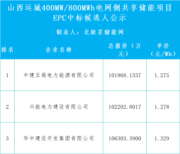 中标候选人第1名为中建五局电力能源有限公司,投标报价1,019,681,336.60 元人民币,折合单价1.275元/Wh;