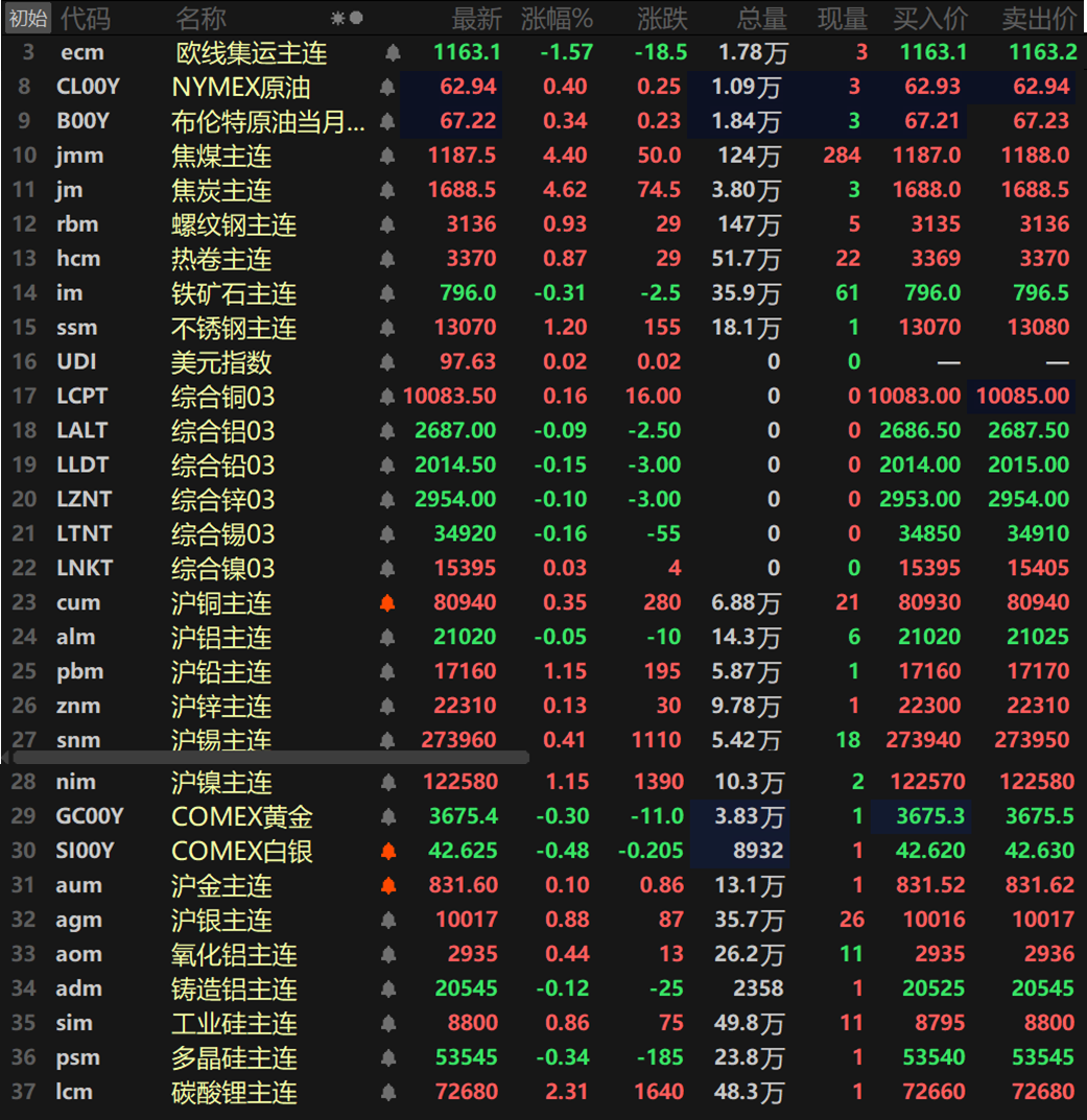 黑色系方面普涨,铁矿唯一下跌,跌幅达0.31%。螺纹涨0.93%,热卷涨0.87%。不锈钢涨1.2%。双焦方面一同涨逾4%,焦煤涨4.4%,焦炭涨4.62%。