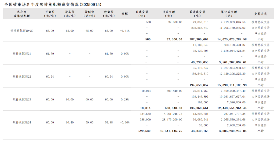 2025年1月1日至9月15日,全国碳市场碳排放配额成交量79,639,741吨,成交额5,705,395,462.15元。