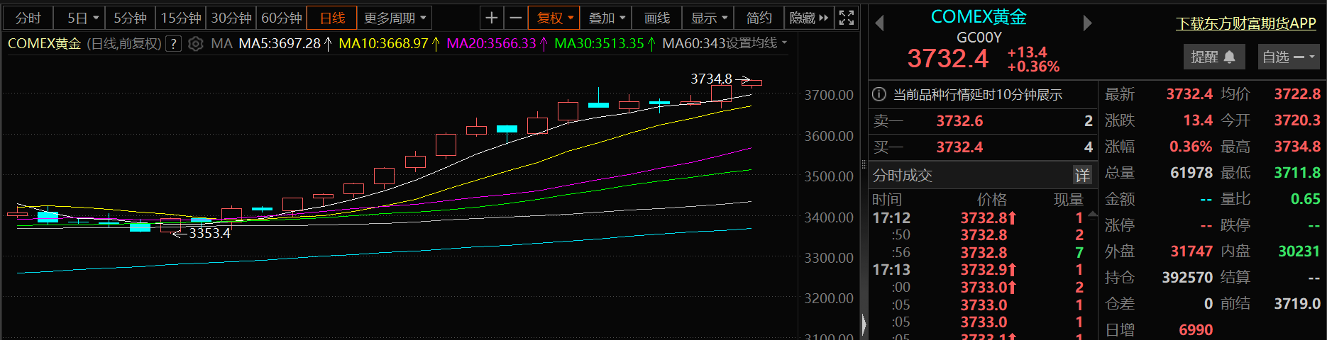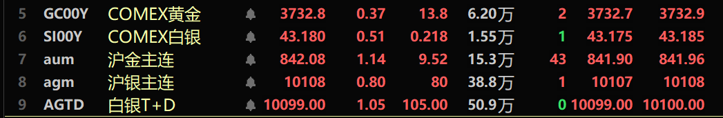 美国近来公布的一系列数据表现疲软,使得市场对美联储 9 月降息的预期逐渐增强,而降息预期的持续升温,给美元指数带来压力,进而给贵金属期货带来支撑;中东地区的紧张局势持续,叠加俄乌冲突及泰柬地缘政治紧张局势等均推动市场避险情绪上升;全球央行和机构投资者寻求非美元、非信用的实物资产来保值,黄金和白银的投资需求增加以及白银供需偏紧的结构等均支撑贵金属价格走强,截至9月16日17:23分,COMEX黄金0.37%,报3732.8美元/盎司,盘中刷新历史新高至3734.8美元/盎司;COMEX白银涨0.51%,报43.18美元/盎司,盘中刷新自2011年9月以来的新高至43.235美元/盎司;沪金主连涨1.14%,盘中刷新历史新高至842.2元/克;沪银主连涨0.8%,报10108元/千克,盘中刷新上市以来的历史新高至10152元/千克;白银T+D涨1.05%,报100039元/千克,盘中刷新上市以来的历史新高至10099元/千克。