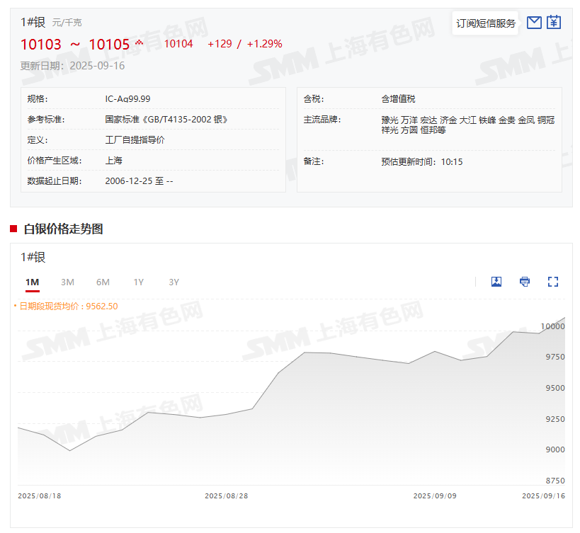 随着沪银再刷历史新高,白银现货价格也突破了历史高位!9月16日,SMM1#白银上午出厂参考均价为10104元/千克,均价较前一交易日上涨129元/千克,涨幅为1.29%。据SMM了解,银价频创历史新高尤其是站上万元大关之后,现货市场呈现供应较少、需求也稀少的供需双弱的局面,现货市场成交几近停滞。