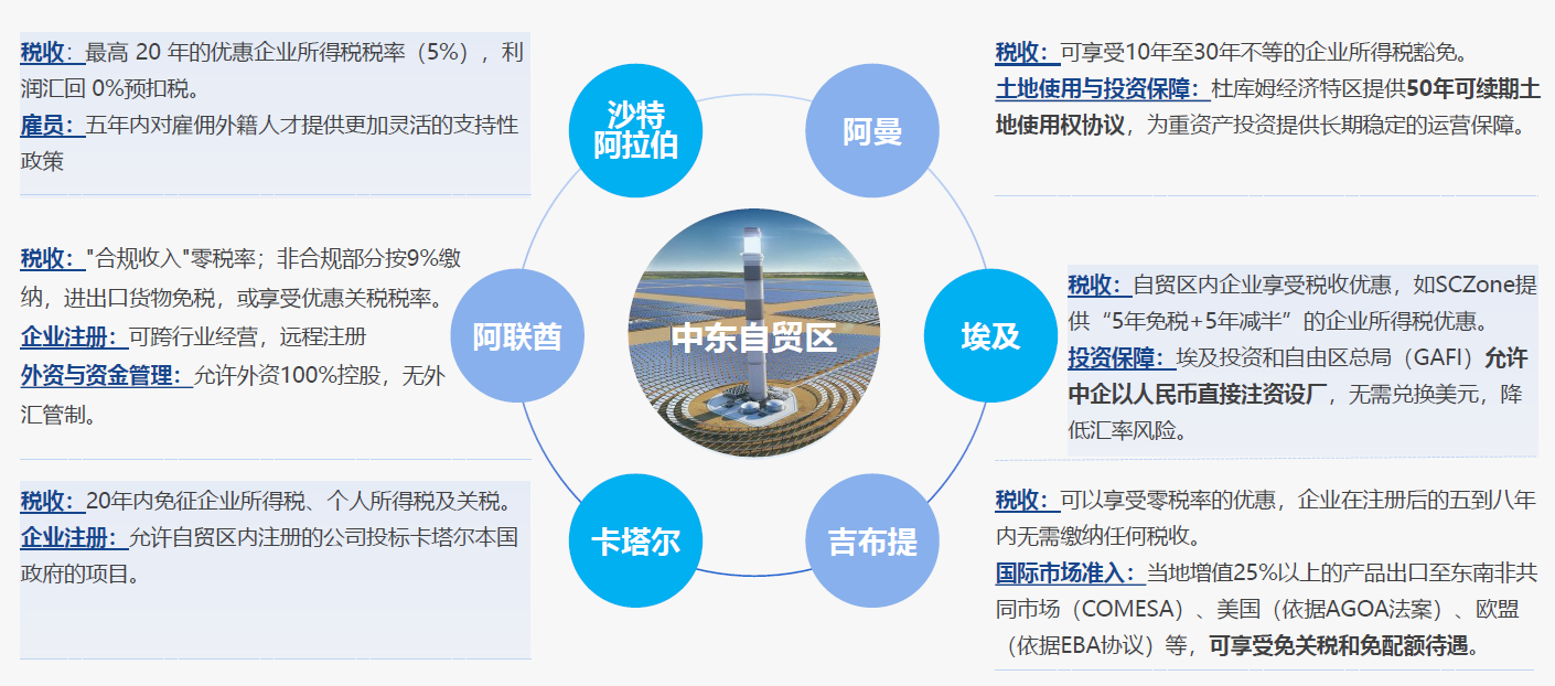 •目前沙特阿拉伯设5个经济特区;阿联酋设自贸区逾40个;阿曼设3个自贸区及1个经济特区;埃及设11个自贸区;吉布提目前主要有4个自贸区;卡塔尔设2个自贸区,2个经济特区。