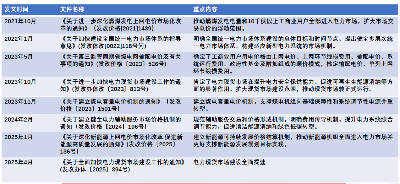 •2025年4月29日,国家发展改革委办公厅、国家能源局综合司发布了《关于全面加快电力现货市场建设工作的通知(发改办体改〔2025〕394号)》,明确要求2025年底前基本实现电力现货市场全覆盖。