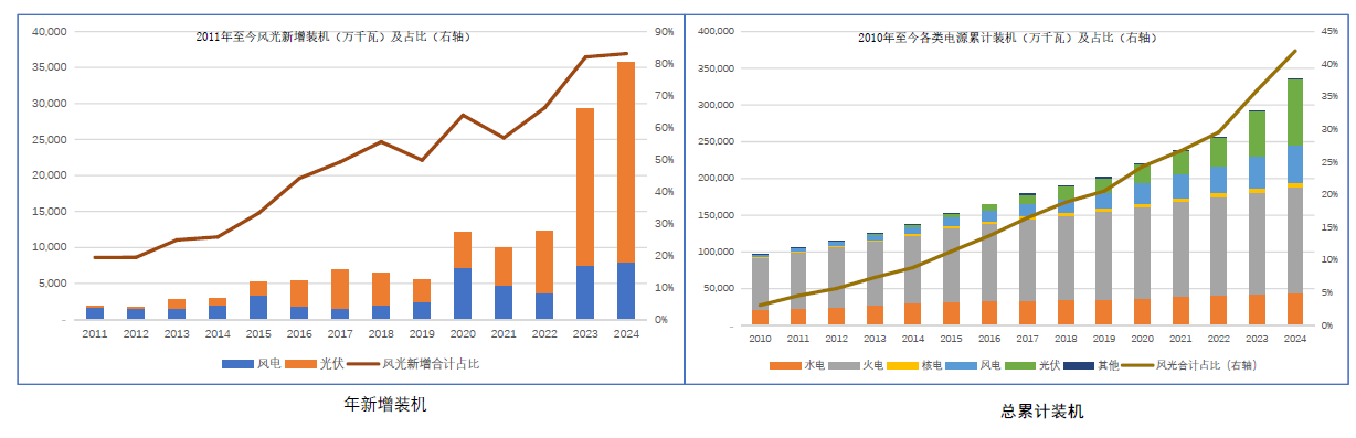 • 截至2025年5月,我国电力总装机36.1亿千瓦,光伏装机10.8亿,风电装机5.7亿。