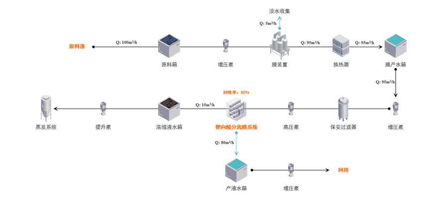 系统设计采用耐酸膜系统,结合其特性,酸性工况下依托耐酸膜反向渗透原理(截留率:平均99%、最高99.3%、最低95%),实现产水酸净化与浓水浓缩减量;产水收集至产水箱回用,浓水收集至母液罐,经PH调节后进行高盐份蒸发结晶。