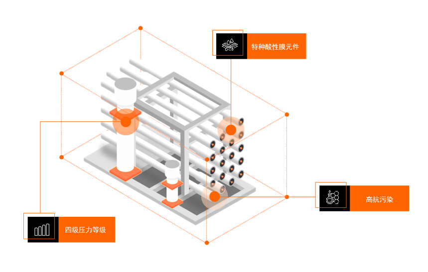 本系统设计采用靶向酸分离膜系统,是结合耐酸膜元件的特性,可在酸性工况下利用耐酸膜反向渗透原理,实现对产水酸净化处理,及浓水浓缩减量。