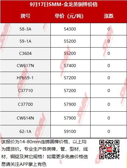 【SMM价格】2025年9月17日金龙黄铜棒价格