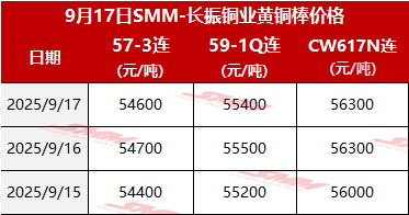 【SMM价格】2025年9月17日长振黄铜棒价格