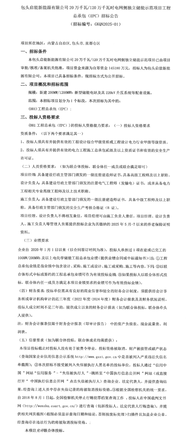 北极星储能网讯:9月17日,包头启能新能源有限公司发布20万千瓦/120万千瓦时电网侧独立储能EPC招标公告,项目资金来源为自筹资金145180万元,约合单价1.21元/Wh,项目位于内蒙古包头市。