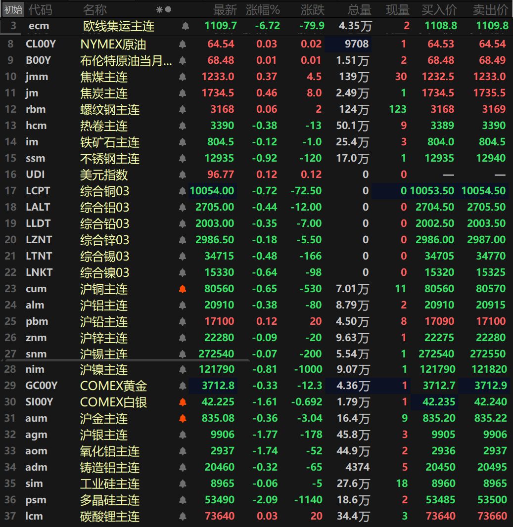 此外,碳酸锂主连涨0.03%,多晶硅主连跌2.09%,工业硅主连跌0.06%。欧线集运主连跌6.72%报1109.7。