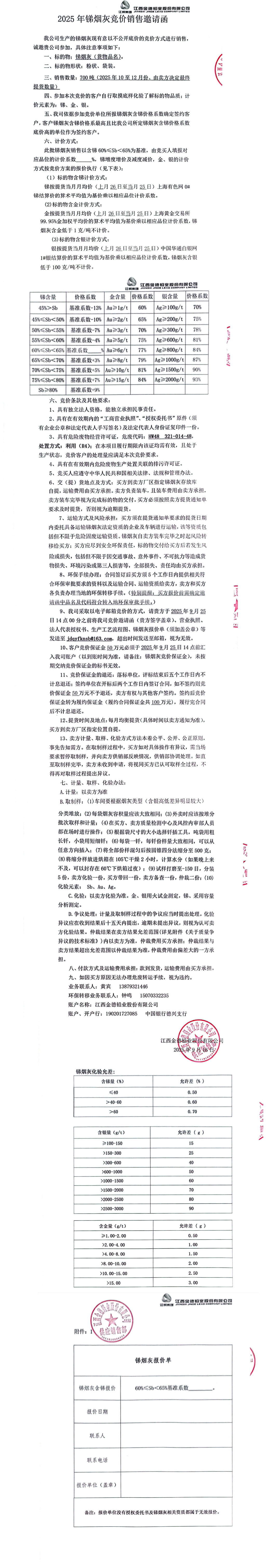 近期,江西金德铅业股份有限公司发布2025年锑烟灰竞价销售邀请函,销售数量约700吨(2025年10至12月份、由卖方决定最终提货数量)。