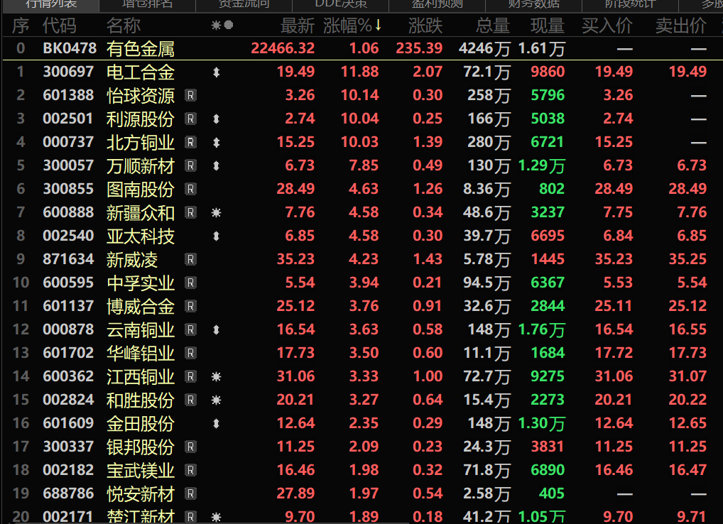 9月以来,国内高层会议传递出积极信号,官方连续出台一揽子政策,市场理解为国内宏观政策预期向好,这有利于提振市场对有色金属等周期行业的信心;9月作为传统的行业旺季,以及随着双节补库的到来,市场对铜、铝等下游需求向好的预期也支撑有色金属行业;此前,9月17日股市整体表现较好,在股市上涨的带动下,市场风险偏好上升,部分青睐有色金属板块的资金推动其价格上涨;有色金属行业尾盘出现拉升,截至9月17日收盘,有色金属板块涨1.06%,个股方面:怡球资源、利源股份、北方铜业涨停,电工合金涨11.88%,万顺新材、图南股份、新疆众合、云南铜业、华峰铝业、江西铜业以及宝武镁业等涨幅居前。